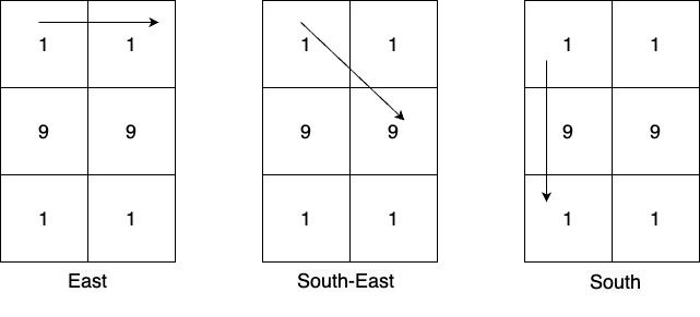 paths from the cells namely: east, south-east, south, south-west, west, north-west, north, and north-east.1, 9, 1